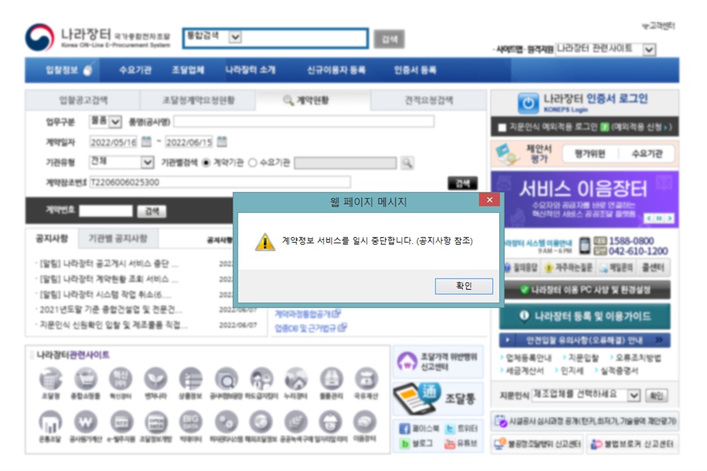 이런 상황을 둘러싸고 며칠간 언론의 의혹 제기가 계속되자 지난 14일 오후 12시경 조달청 나라장터는 계약현황 조회 서비스를 아예 중단시켜버렸다. 15일 현재까지도 해당 수의계약 건에 대한 계약정보조회 서비스는 여전히 중단된 상태다. 상황을 미루어보아 대통령비서실은 ㈜다누림건설과의 수의계약 건을 비공개로 재분류한 것으로 보인다.