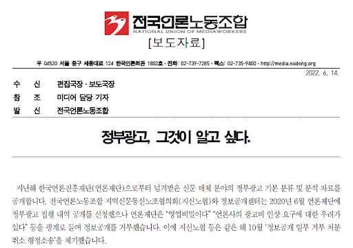 재판에서 이겨서 받아낸 자료는 2016년 부터 2020년 5월까지 전국 공공기관이 신문매체에 낸 31만건이 넘는 정부광고 집행 내역으로, 3176개에 달하는 공공기관이 해당 기간 동안 어느 신문 매체에 어떤 내용의 광고 냈고, 광고비는 얼마였는지 확인할 수 있는 내용입니다. 전국언론노동조합은 해당 자료를 분석하고, 지난 6월 14일 보도자료를 통해 발표했습니다. (보도자료 링크)