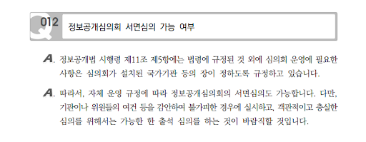 이처럼 서면심의는 제대로 된 심의로 이어지기 어렵기 때문에, 행정안전부가 발간한 [정보공개 운영 안내서]에서는 ‘불가피한 경우에’만 서면심의를 실시하고, 가능한 한 출석 심의를 하는 것이 바람직하다고 설명하고 있습니다. 물론 코로나19 유행 초기에는 대면 회의가 어려운 만큼 여러 공공기관에서 서면심의를 진행했습니다.