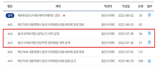 용산구의회의 경우 이미 지난 달, 의회 홈페이지에 의원 겸직신고 내역을 공개하는 것과 더불어, 민간부문 업무활동 내역 역시 함께 공개했다. 은평구의회 역시 지방의회의 투명성 강화와 신뢰 확보를 위해 민간부문 업무활동 내역을 사전적으로 공개하길 바란다.