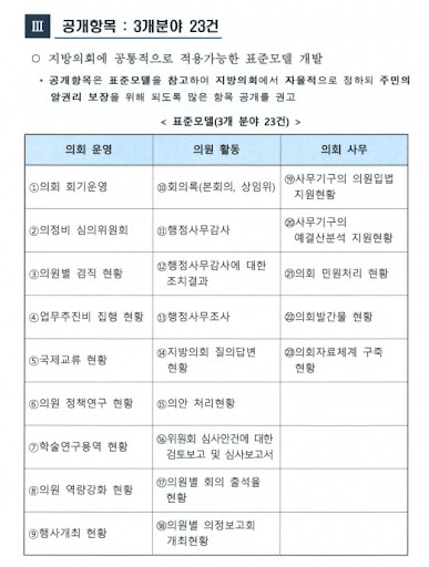 지침에서는 의회 운영, 의원 활동, 의회 사무 3개 분야로 나누어 23건의 공개 항목을 제시하고 있다. 이중에서는 겸직 현황처럼 새롭게 법적인 공개 의무가 생긴 항목도 있지만, 의정비 심의위원회처럼 원래 공개 의무가 있었지만, 구청 홈페이지에 올라오고 있어 정작 의회 홈페이지에서 찾아보기 힘들었던 정보도 있다. 업무추진비, 국제교류 현황처럼 조례로 대부분 지방의회에서 조례로 공개하고 있던 정보도 있으나, 정책연구 현황, 학술연구용역 현황, 행사개최 현황 등 대부분 지방의회가 잘 공개하지 않던 항목들도 새롭게 추가되었다.