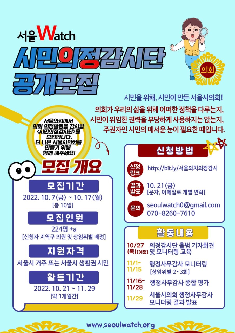 서울Watch에서 이 활동을 함께 할 <시민 의정 감시단>을 모집합니다.