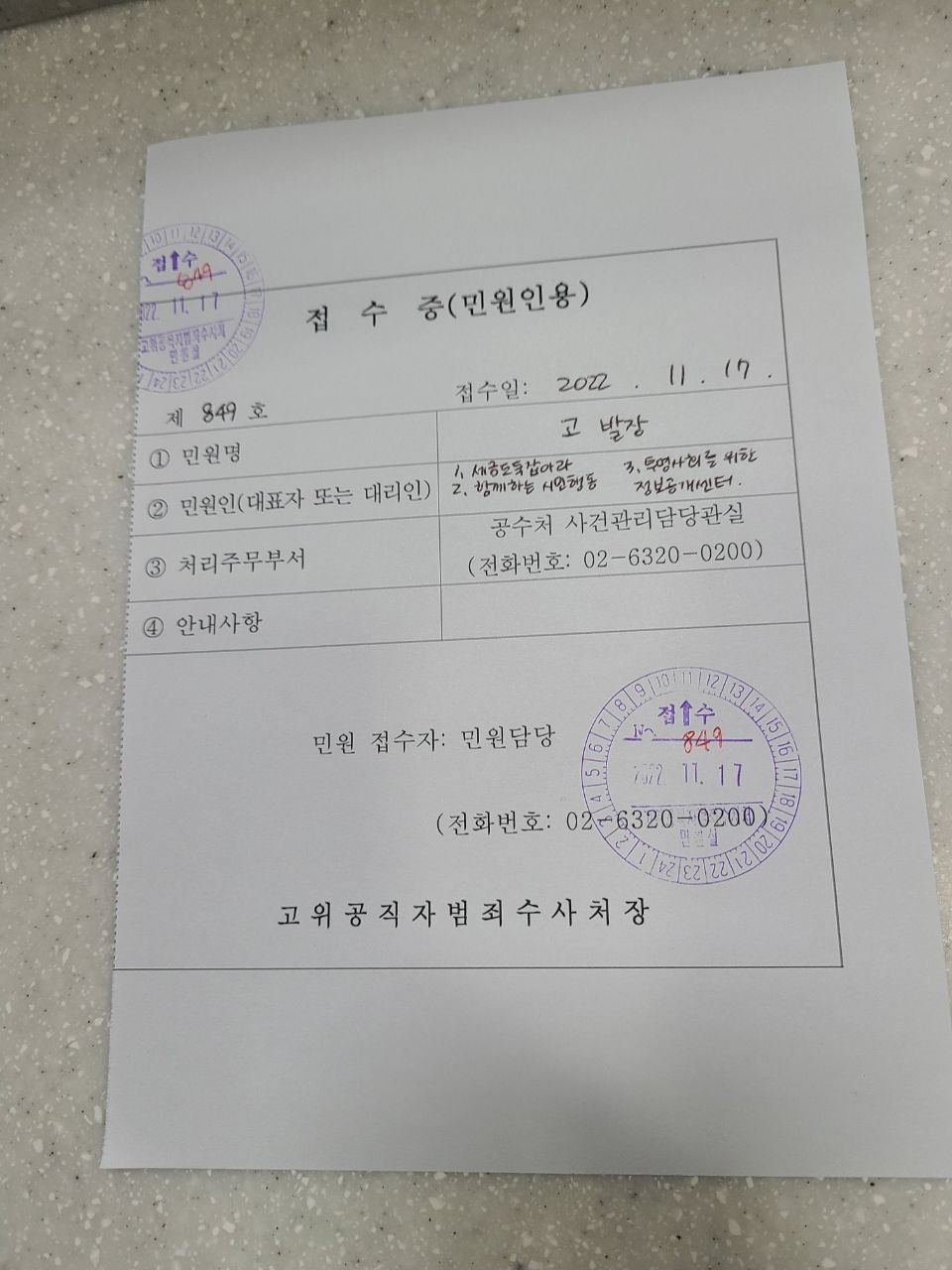 국회의원 14명에 대한 공수처 고발 접수증
