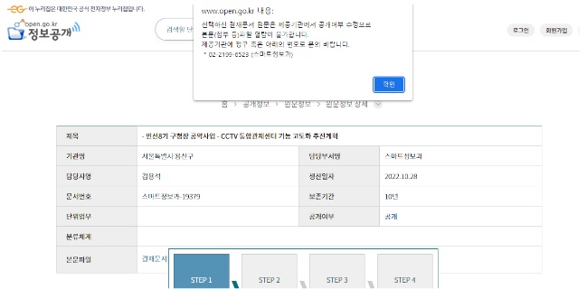 한편, 정보공개포털에서 ‘원문공개’로 구분되어 공개된 문건인 “- 민선8기 구청장 공약사업 – CCTV 통합관제센터 기능 고도화 추진계획”에 대해, 공개 여부가 수정되었다고 안내되고 있다(11/18 오후 1시 현재, 아래 박스 안 참고).