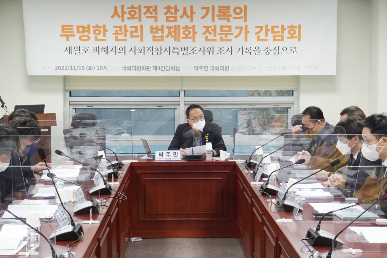 지난 11월 15일에 박주민 국회의원은 <사회적 참사 기록의 투명한 관리 법제화> 전문가 간담회를 개최 했습니다. 이 간담회에서는 세월호 참사 진상규명 업무를 수행했던 사회적참사특별조사위원회(사참위) 조사 기록들을 체계적 관리와 세월호 참사 피해자들이 조사 기록에 어떻게 접근이 가능하도록 할 것인지, 그리고 그것들을 위한 입법은 어떤 식으로 이루어져야 하는지 진지한 토론이 이뤄졌습니다.