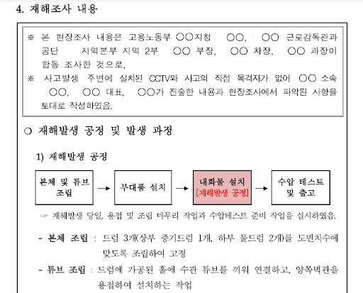 경찰조사 이후에는 노동청과 안전보건공단이 현장조사를 진행하여 산업안전보건법이나 중대재해처벌법 위반 혐의가 있는지 살펴보게 됩니다. 이때 현장조사를 통해 작성된 재해조사의견서가 사고의 원인을 규명하고, 책임을 따지는데 가장 중요한 근거가 됩니다. 현장조사가 끝나면 보통 작업을 재개하기 위해 청소나 정리를 진행하기에, 현장의 상황이 어떠한지 전문가가 제대로 확인할 수 있는 유일한 기회라 할 수 있습니다.