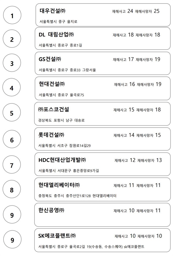 지난 5년간 자료에서 중대재해가 다수 발생한 상위 위험기업 10곳 대부분이 대형 건설사라는 점도 눈에 띈다. 아무래도 사업장에 위험 요소가 많고 작은 실수가 큰 사고로 이어질 수 있는 특수성이 있는 업종이다. 그만큼 노동자의 생명을 보호할 수 있도록 안전관리를 철저하게 이행하고 있는지 기업도 다시 확인하고 정부도 꼼꼼하게 관리해야 할 부분이다.
