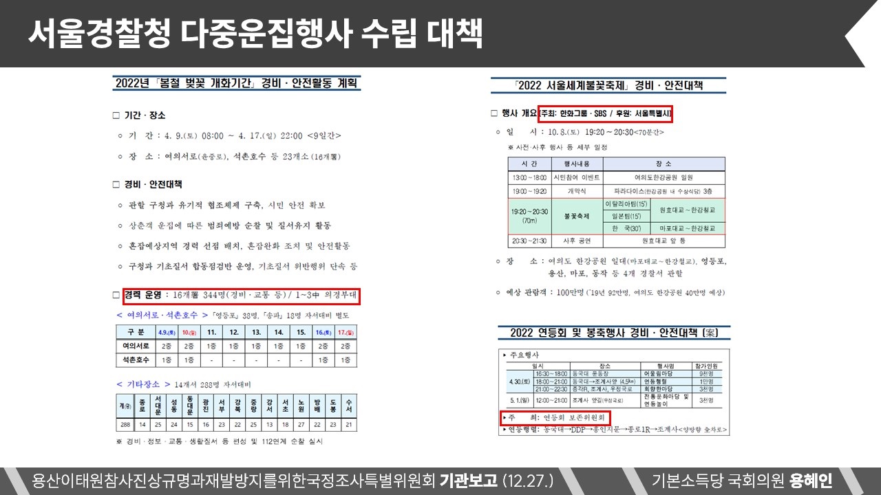 참사 직후 정부, 지자체, 경찰 등 책임 기관들은 '주최자 없는 행사'에 대한 안전 관리 매뉴얼이 없었다고 주장하며 책임 회피에 나섰다. 하지만 12월 27일 국정조사에서 용혜인 의원이 경찰청으로부터 제출받은 '2022년 봄철 벚꽃 개화기간 경비·안전활동' 문서를 살펴보면, "서울 전역에 벚꽃이 만개하는 시기에 인파가 몰릴 테니 여의서로, 석촌호수에 의경부대 배치할 것"을 수립하고 경력을 편성한 바 있다. 또한 용 의원은 "지난 크리스마스에도 인파가 모일법한 지역에 선제적으로 경찰관 기동대를 배치했다"는 점을 지적했다.
