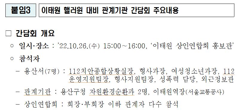 10월 26일 진행된 '핼러윈 대비 관계기관 간담회' 역시 용산경찰서와 구청, 역장과 상인회가 만나는 4자회의였으나 용산구청 측은 자원순환과 공무원 두 명만을 참석시켰다. 용산구청은 역대 핼러윈 축제에 대비한 구체적인 내용을 알기 위해 시민들이 청구한 2017년~2022년까지 핼러윈 대비 회의 자료와 회의록을 수사 자료라는 이유로 전부 비공개했다.