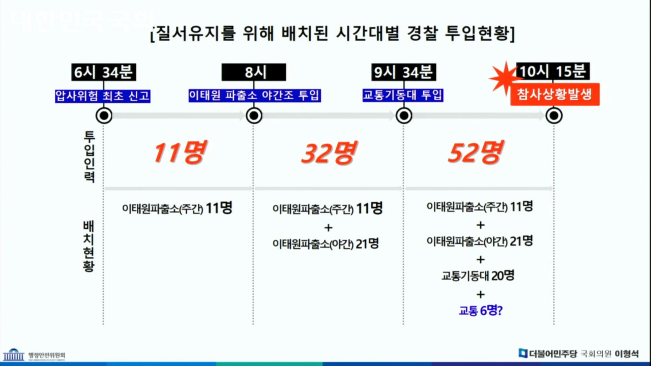 신고 내역을 살펴보면 당시 현장은 참사 장소뿐 아니라 이태원 일대의 교통 및 인파 통제를 요청하는 다수의 신고 전화가 빗발치는 상태였다. 그러나 경찰청에서 제출한 '당일 정복 경찰의 배치 현황' 자료에 따르면 이태원에 112 신고 처리에 배정된 파출소, 지구대 경찰은 단 32명에 불과했다. 게다가 11월 7일 국회 행안위 이형석의원의 질의를 통해 이마저도 오후 8시까지는 주간 근무 인원인 11명이 모든 신고에 대응해야 하는 상황이었음이 확인되었다.