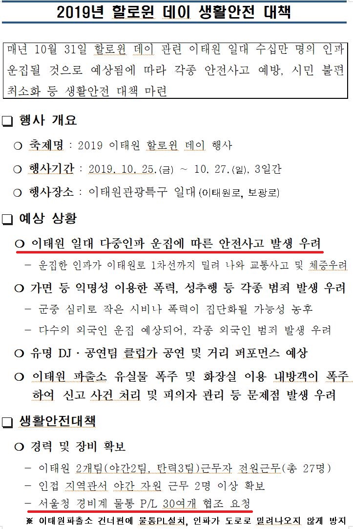 또한 서울청에서 작성한 '핼러윈데이' 치안여건 분석 및 대응방안 보고 문서에 따르면, 이태원 관광특구에 112신고가 2배 이상 급증할 것을 이미 예측했고 사건 유형 역시 기타형사, 교통불편, 보호조치, 폭력 등으로 분석되어 교통기동대 외에도 현장의 경비인력 지원이 필요한 상황이라는 것을 충분히 가늠할 수 있었다.
