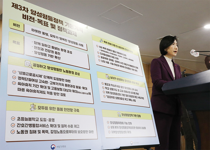 최근 여성가족부는 제3차 양성평등정책 기본계획(2023~2027년)을 발표했습니다. 이 계획의 주요 내용 중 하나는 노동시장 내 성별 격차 완화를 위한 '성별 근로공시제'의 도입입니다. 기업이 자율적으로 채용, 승진, 해고, 퇴직 시 항목별로 성별 비율에 대한 정보를 공개하도록 하겠다는 제도입니다. 그뿐 아니라 매년 상장법인, 공공기관의 근로자 성별임금격차 현황을 조사하고, 또 성별임금격차 관련 통계를 세분화하겠다고 밝히기도 했습니다.