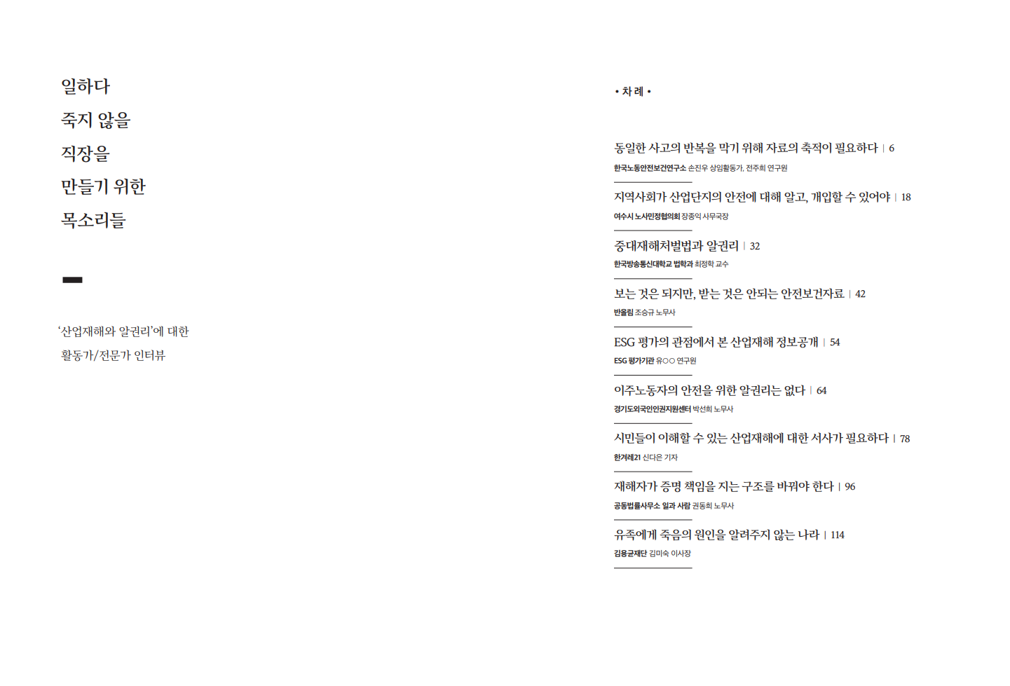 그뿐 아니라 '알권리'에 초점을 맞추어 산업재해 문제를 살펴본 인터뷰 작업도 함께 진행했습니다. [일하다 죽지 않을 직장을 만들기 위한 목소리들 : ‘산업재해와 알권리’에 대한 활동가/전문가 인터뷰]입니다. 정보공개센터 활동가들이 여러 활동가와 전문가들을 만나 일터에서 위험요인을 제대로 알기 어려운 문제, 산업재해 피해자들이 산재 인정 절차에서 겪는 장벽들, 산재에 대한 정확한 통계도 알기 어려운 현실, 유가족에게도 알려주지 않는 사고의 진실, 정보접근에서 배제된 이주노동자 등에 대해 이야기를 들은 내용을 정리했습니다.