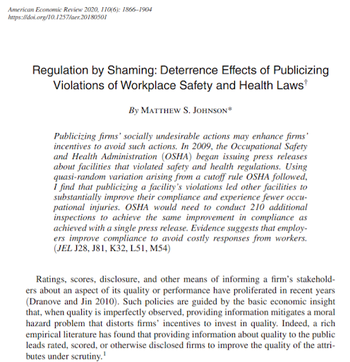 오바마 정부 8년 간 OSHA를 이끌었던 데이비스 마이클스 전 청장 역시 중대재해에 대한 정보를 널리 알리는 것의 중요성을 강조했다. 그는 “심각한 법 위반 사례를 자세히 설명하는 보도자료 하나가 210번의 안전 감독과 같은 효과를 낸다”는 미국의 노동경제학자 매튜 존슨의 연구 결과를 인용하기도 했다.