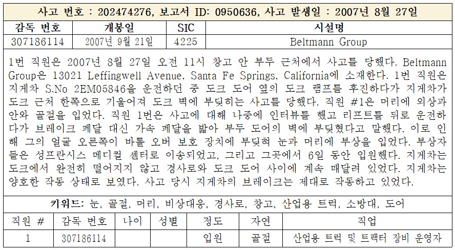 어느 기업에서 어떤 사고가 일어났는지, 그 원인은 무엇이고 누가 어떻게 책임을 졌는지 그 누구도 알 수가 없는 게 현실이다. 사고 목록도, 정보도 공개되지 않는 상황에서 단편적으로 요약된 사고 사례만 남기 때문에, 분석하고 참고할 만한 산업재해 데이터베이스가 구축되지 못하고 있다. 기업의 안전관리 담당자도, 산업안전 분야 연구자도, 정책 생산자들도 신뢰할 만한 데이터를 확보하기 어렵다.