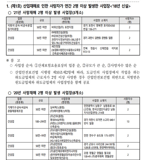 사실 한국에서도 중대재해 정보를 공개할 제도적 근거는 이미 충분히 존재한다. 이미 산업안전보건법 제10조에 따라 2003년부터 매년 산업재해 다발 사업장의 명단이나 사고 발생 건수 등을 공개하고 있으며, 중대재해처벌법 제13조에서도 중대산업재해 발생 사실을 공표하라고 명시되어 있다.