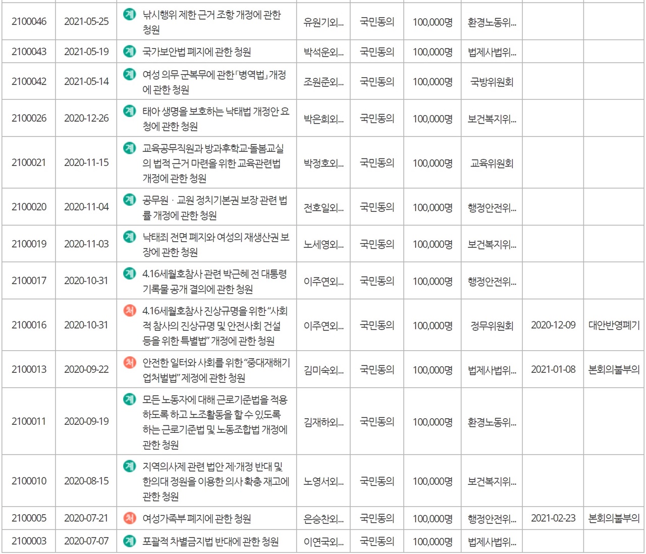 ▲ 21대 국회에 접수된 국민동의 청원 일부. 녹색 표시가 계류 중인 청원이다. ⓒ 국회