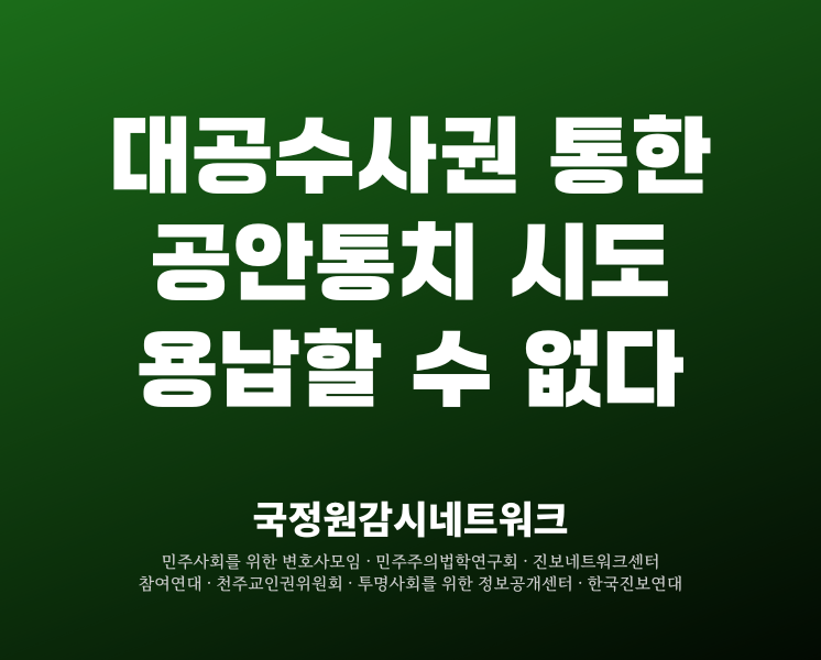 - 국정원은 민주노총에 대한 대대적인 공개 수사를 통해 대공수사권 이전에 반대하는 언론플레이를 벌이고 있다. 그런데도 윤 대통령은 국정원의 대공수사권 존치를 사실상 공식화하고, 여당 지도부는 공안몰이성 발언을 쏟아내고 있다. 대통령과 여당이 노동시민사회단체들의 합리적 비판까지 탄압하기 위해 대공수사권을 쥔 국정원을 앞세워 공안몰이를 하려는 의도를 드러낸 것이다. 국정원을 활용해 공안정국을 조성하고 이를 국정 동력으로 삼겠다는 시도는 결코 성공할 수 없다.