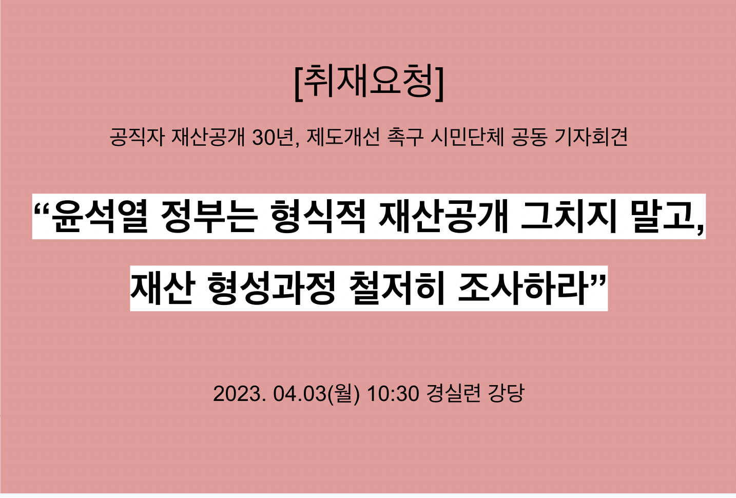 1. 2023년 4월 3일(월) 오전 10시 30분, ‘공직자 재산공개제도 개선을 촉구하는 시민단체 공동 기자회견’이 경실련 강당에서 있을 예정입니다.