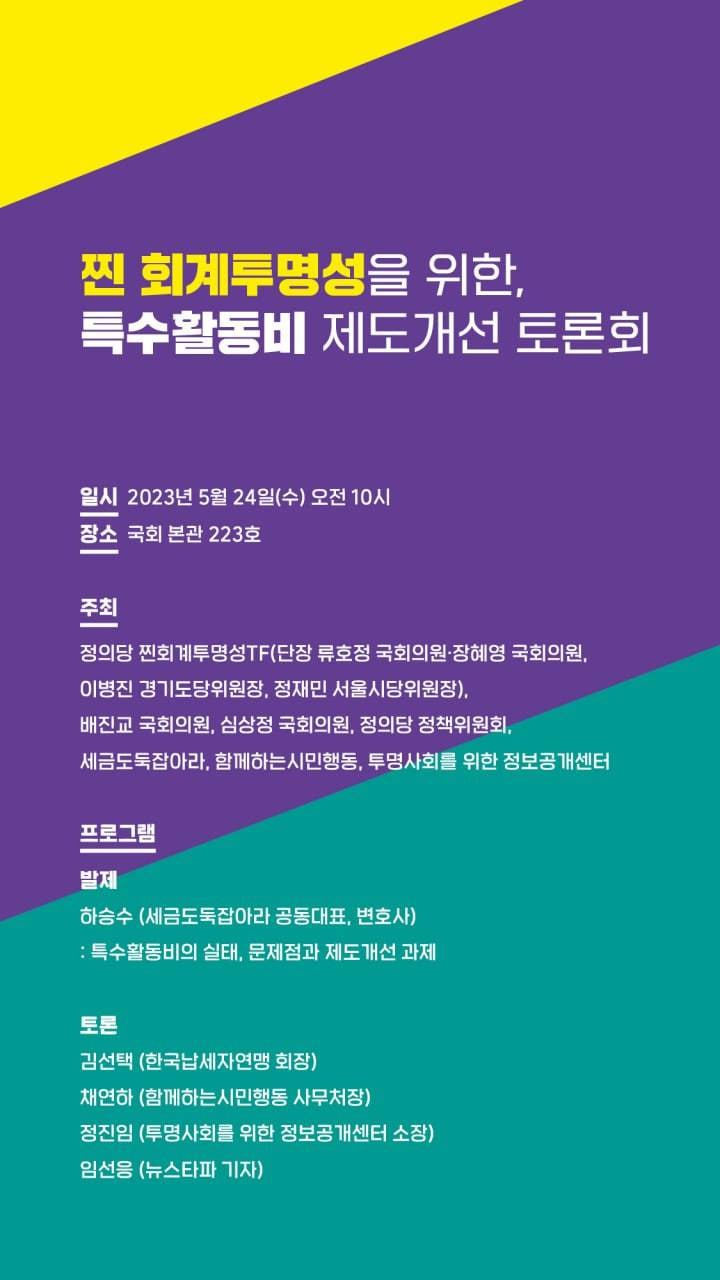 - 주최 : 정의당 찐회계투명성TF, 배진교 국회의원, 심상정 국회의원, 정의당 정책위원회, 세금도둑잡아라, 함께하는시민행동, 투명사회를위한정보공개센터