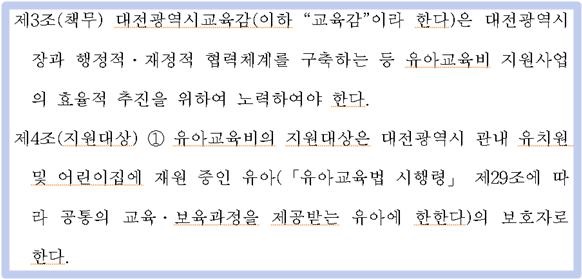 교육위원회에서 부결된 법안을 보면 '대전교육감은 대전시장과 협력해 유아교육비 지원사업의 효율적 추진을 위해 노력해야 한다'고 명시하고 있는데요. 마치 시장의 공약 이행을 위해 조례안을 만든 것처럼 보입니다.