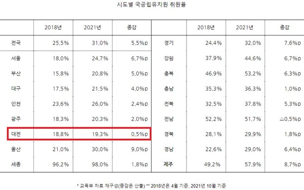 정의당 이은주 의원이 교육부로부터 제출받은 자료에 따르면, 2021년 기준 대전 국공립유치원 취원율은 19.3%로 광역시 중 꼴찌를 기록하고 있습니다. 그런데도 대전시와 시의회는 국공립유치원은 나 몰라라 한 채, 오직 이 시장의 공약을 이루는 데만 몰두하고 있습니다.