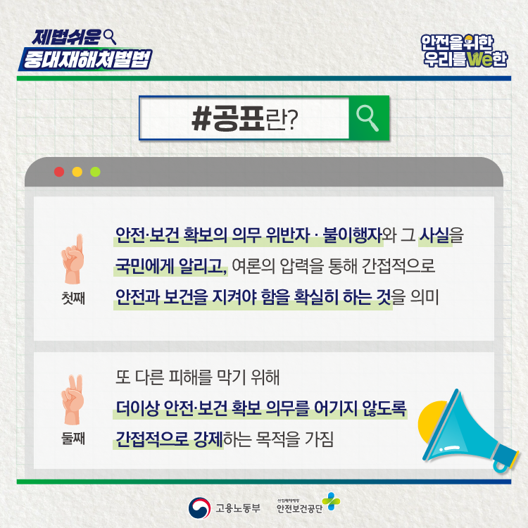 그런데, 중대재해처벌법에는 '중대산업재해 발생사실 공표'라는 제도가 있습니다. 이에 따르면 사업주와 경영책임자가 안전 및 보건 확보 의무를 위반하여 형이 확정 된 경우, 고용노동부장관은 해당 사업장 명칭, 발생 일시와 장소, 재해의 내용 및 원인 등을 공표해야 합니다. 판결로 형이 확정되면, 고용노동부는 먼저 공표 대상 사업주에게 이를 통지한 후, 30일 이상의 기간 동안 소명 절차를 거칩니다. 이후 '중대산업재해 발생사실의 공표'라는 제목으로 관보, 고용노동부나 안전보건공단 홈페이지에 1년 간 게시하도록 되어 있습니다.