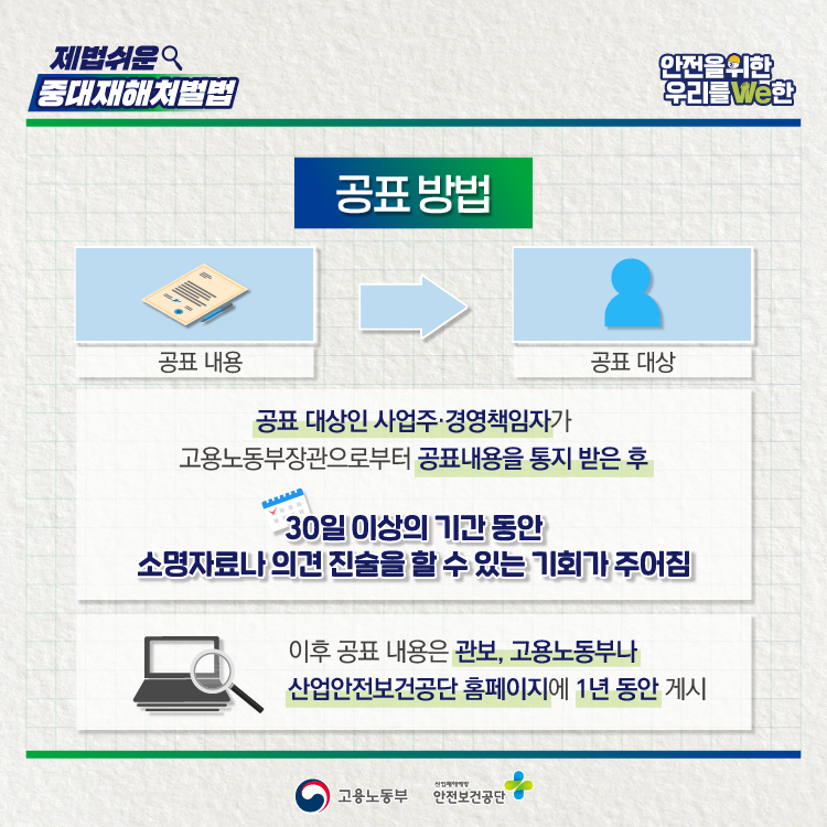 그런데, 중대재해처벌법에는 '중대산업재해 발생사실 공표'라는 제도가 있습니다. 이에 따르면 사업주와 경영책임자가 안전 및 보건 확보 의무를 위반하여 형이 확정 된 경우, 고용노동부장관은 해당 사업장 명칭, 발생 일시와 장소, 재해의 내용 및 원인 등을 공표해야 합니다. 판결로 형이 확정되면, 고용노동부는 먼저 공표 대상 사업주에게 이를 통지한 후, 30일 이상의 기간 동안 소명 절차를 거칩니다. 이후 '중대산업재해 발생사실의 공표'라는 제목으로 관보, 고용노동부나 안전보건공단 홈페이지에 1년 간 게시하도록 되어 있습니다.