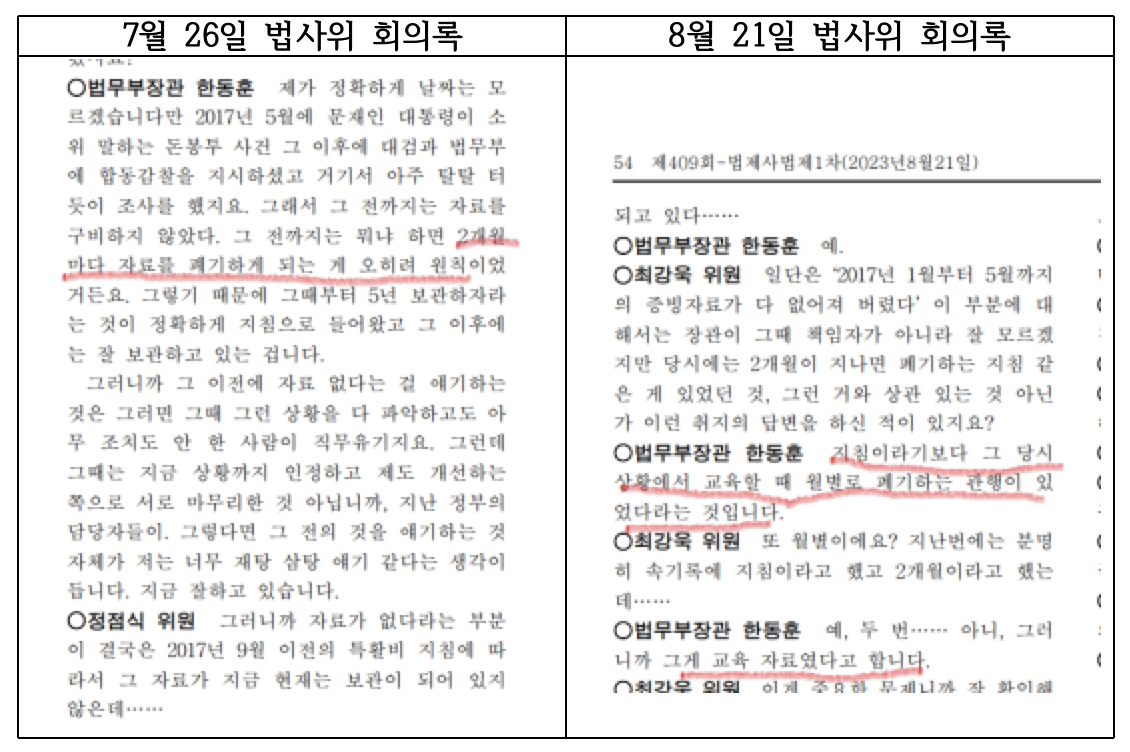 - 그런데 한동훈 법무부 장관은 검찰 조직내부에서 이뤄진 범죄행위에 대해 수사나 감찰을 하기는커녕, 이를 비호하고 있다. 또한 해명도 오락가락하고 있다. 7월 26일 국회 법사위에서는 ‘2개월마다 자료를 폐기하게 되는 게 오히려 원칙’이었다고 발언했다. 언론들은 이런 지침이나 규정이 있는 것으로 받아들였다.