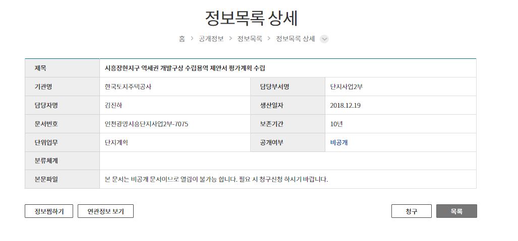 사실 대부분의 행정기관과 공사/공단의 문서 수발신 내역은 '정보공개포털'의 정보목록에서 검색해 볼 수 있는데요, 여기에서 '한국토지주택공사'의 정보목록을 몇 가지 키워드로 검색해보면 2018년 12월 신도시 계획 발표당시 개발 관련 업무의 담당자들이 누구인지, 각 부서에서 어떤 내용의 업무결재가 있었는지 대략적인 개요를 알 수 있습니다.