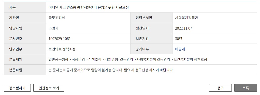 공공기관은 업무와 관련한 행위를 기록으로 남길 의무가 있으니 그 기록을 보면 이태원 참사 관련 어떤 수습 및 대응 활동을 했는지 확인할 수 있지만 국무총리실이 공개한 정보로는 확인할 길이 요원하다.