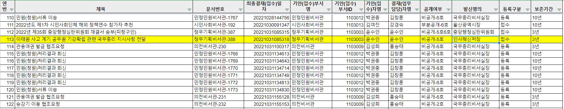 투명사회를위한 정보공개센터는 10.29 이태원 참사가 있기 5일 전인 10월 24일부터 참사 발생 이후 정부의 대응이 본격화되었던 11월 8일까지 국무총리비서실의 기록물 등록대장을 정보공개청구했다.