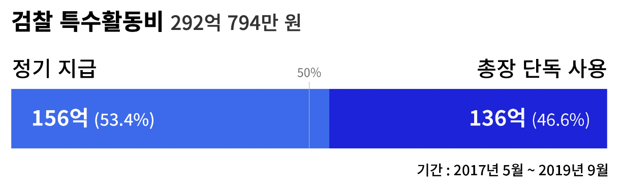 검찰은 2017년 5월부터 2019년 9월까지 2년 5개월 간 특수활비로 약 292억 794만 원 (29,207,942,900원)을 사용했습니다. 이 중 고검과 지검, 지청 등에 매월 정기적으로 지급한 돈이 약 155억 9514만 원(15,595,144,800원)으로 확인됐습니다. 전체의 53.4%입니다.